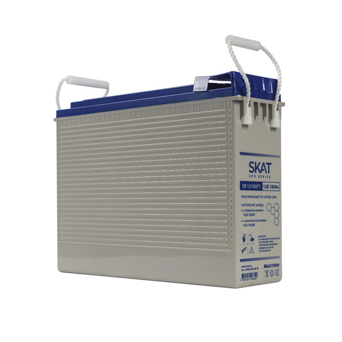 SKAT SB 12100FT - свинцово-кислотный, герметичный, необслуживаемый АКБ с системой рекомбинации газов VLRА, предназначен для использования в составе системы резервного питания. Герметизация батарей проводится посредством использования клапана, обеспечивающего сброс избыточного давления газов в аккумуляторе для предотвращения деформации корпуса, таким образом излишний газ не скапливается внутри батареи.