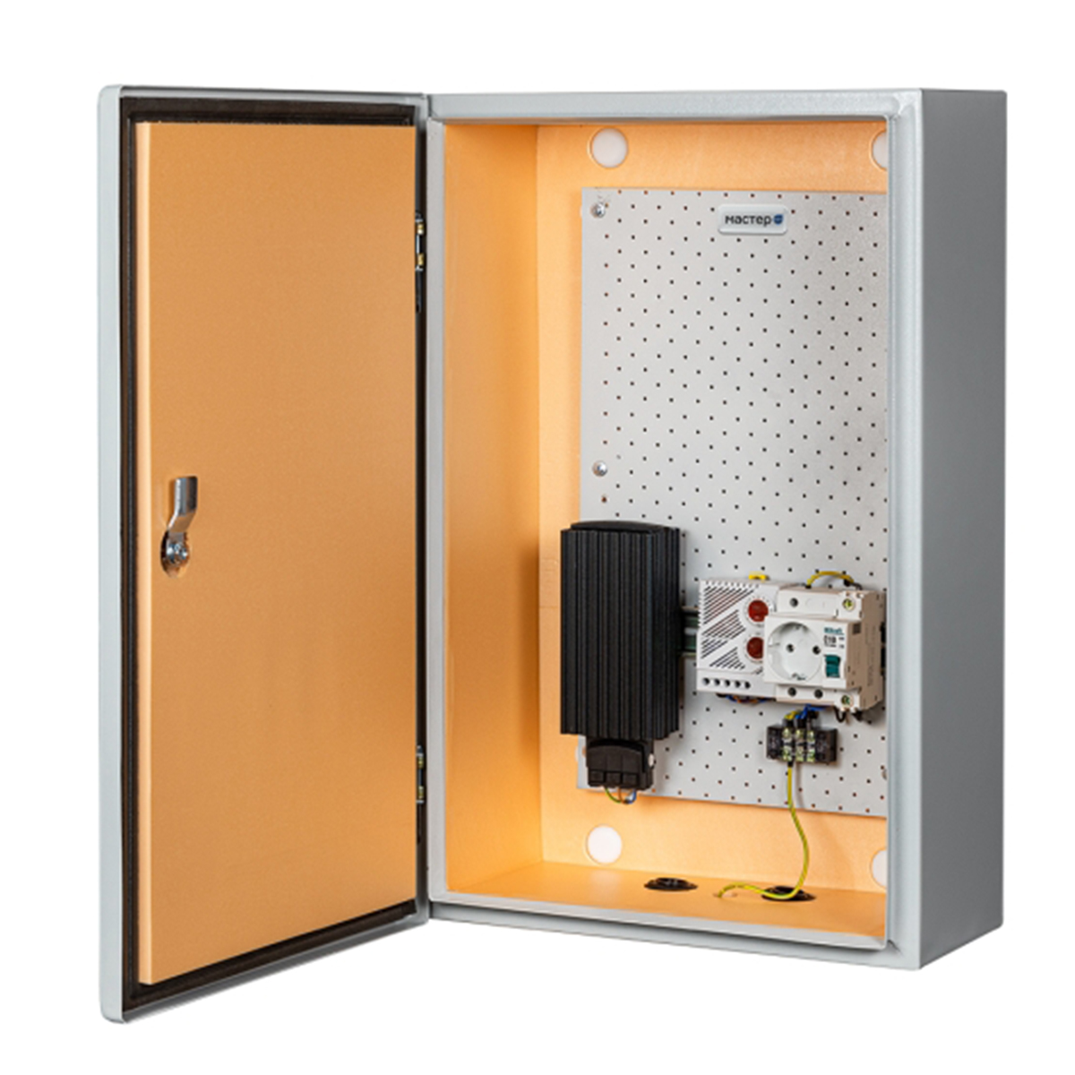 • комплектация: утеплитель из пенополистирола, замок 1шт., ключ 1шт., монтажная плата 1шт., гермовводы 2шт., розетка 1шт., автоматический выключатель 1шт., гигростат NT78-M (электронный) 1шт., нагреватель мощностью в 75Вт. 1шт.